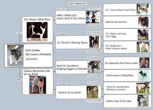 Né le 20 mai 2013 Couleur : Fauve charbonné à panachures blanches Confirmé Excellent Cotation : Recommandé Tan : Ok Tests santés : effectués Dysplasie FCI : AA Luxation de la Rotule (Patellas) : Normal Empreinte génétique avec parenté obtenue Gêne poil long : non porteur |