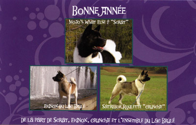 Mars 2009 : - Ashka se classe 1ère au classement Top Chien Satisfaction 2008 Akita Américain, suivi de son frère Tazan qui prend la 2nde place du classement (et du 1er mâle Top Akita 2008). Leur soeur, Asie, est 4ème. Félicitations à M. Eric Prunier, l'élevage "of Sea Bird Sanctuary", qui termine également 1er pour la 2ème année consécutive au classement du grand prix éleveur Plaque Off. - Refonte et mise en ligne du nouveau site Lac Brûlé Akita Américain - Tazan fait 3ème du groupe 5 à Montluçon - Participation d'Ashka à la Crufts |