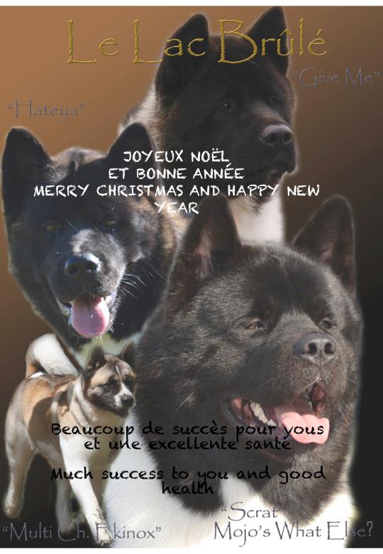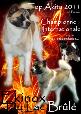 Novembre 2011 : - Nous sommes très heureux d'annoncer la confirmation de gestation d'Ekinox du Lac Brûlé avec notre jeune mâle "Scrat" (Mojo's What Else?). Les naissances sont prévues entre Noël et le 1er de l'an, pour commencer aussi bien l'année 2012 que, l'année 2011, se termine ! En effet, Ekinox est toujours en tête du classement Top Akita 2011 et son titre de Championne est en cours d'homologation.