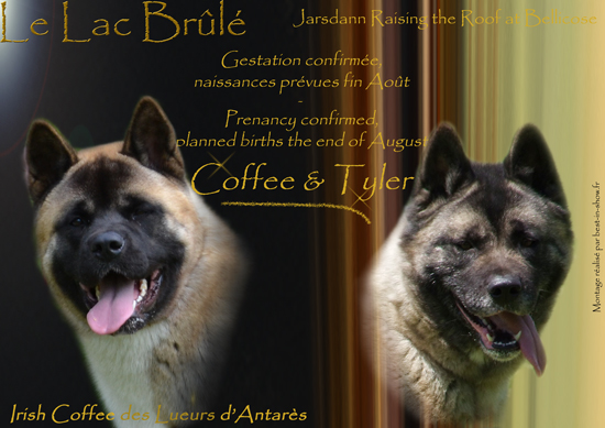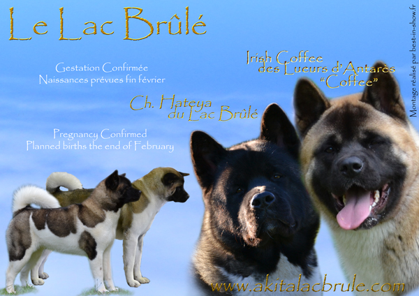 Octobre 2015 : - 1ère expo en France pour nos 2 imports Américains ! Sous les jugements de M. Chapiro, hier à la Spéciale de Race, à Poitiers : Septembre 2015 : - Après le CACS de Sorges de Périgord, les expositions en Californie ! Août 2015 : - Nous avons le plaisir d'annoncer la naissance de 7 chiots (4 mâles et 3 femelles) de Ch. Give Me the World du Lac Brûlé et Whitewreath's Carbon Copy "Baelor" (étalon anglais). Pour cette première portée, Give Me est déjà une parfaite maman, attentive, douce et caline. - Cacs de Chatel-Guyon hier : Last Temptation du Lac Brûlé (BISS-Ch. Coffee x Ch. Hateya), 5 mois et demi : Très prometteur / BOB Baby et Meilleur du Groupe Baby (BOG Baby). BISS-Ch. CsF. Irish Coffee des Lueurs d'Antarès (BIS-Ch. Mojo's What Else ? "Scrat" x Galaxy Remember Me du Lac Brûlé), 2 ans : 1er Excellent / MEILLEUR DE RACE - De retour de Brive, un peu humide, mais avec de super résultats !! Last Temptation du Lac Brûlé "Ti-Punch" (5 mois) gagne un nouveau BEST IN SHOW Baby !!! BISS-Ch. Irish Coffee des Lueurs d'Antarès fait 1er CACIB en Champion, MEILLEUR DE RACE (BOB) puis 3ème de Groupe (BOG3). - Après des milliers de kilomètres parcourus pour réaliser ce mariage au milieu de l'Angeleterre avec Whitewreath's Carbon Copy "Baelor", nous avons la joie de confirmer la gestation de Ch. Give Me the World du Lac Brûlé. Les naissances sont prévues à la fin du mois. Juillet 2015 : - De nouveau MEILLEUR DE RACE pour BISS-Ch.Irish Coffee des Lueurs d'Antarès "Coffee" (n°1 au classement temporaire Top Akita 2015) à la petite exposition nationale d'Aurillac. Il sera présélectionné dans les 6 Meilleurs Champion pour le BIS Champion, et présélectionné dans les 6 Meilleurs de Groupe. - De retour de la Spéciale de Race d'Auch, sous les jugements de M. Mannato : Juin 2015 : - Pendant que le championnat de France avait lieu, de notre coté, 2 petits bouts sont nés, 1 garçon et 1 fille. Crunchie est une maman heureuse ! Mai 2015 : - De retour de l'exposition nationale de Villeneuve sur Lot où les enfants de Scrat (BIS-Ch. Mojo's What Else?) ont brillés sur le ring d'honneur : - Jazz a trouvé une formidable famille, nous sommes très heureux de cette rencontre. - Jazz du Lac Brûlé, est un jeune mâle de 8 mois et demi, qui cherche une nouvelle maison. En plus d'être magnifique, c'est un très gentil chien de compagnie, mais qui a besoin d'un maitre très présent car il déteste la solitude. Il est habitué à une vie de famille en maison avec de très jeunes enfants, et un chat. Il est très sociable avec tout le monde (humains et congénères), et a de bonne notions d'éducations. Pour plus de renseignements et photo, contactez nous. Avril 2015 : - La gestation de Crunchie (Satrebor Roulette) est confirmée. Cela sera la 1ère portée de Ghoover du Lac Brûlé. Naissances prévues début juin. - Ch. Irish Coffee des Lueurs d'Antarès, officiellement Champion de France ! - Nous devons annoncer une triste nouvelle. Notre adorable Ekinox (Multi Ch. Ekinox du Lac Brûlé) nous a quitté en début de semaine. Elle a eu une hémorragie interne suite à son opération de stérilisation, et n'a pu être sauvé malgré toute la bonne volonté de notre vétérinaire. Ekinox était la fille de Ch. Ashka of Sea Bird Sanctuary et Ch. Ruthdales Ready to Rule, elle aurait eu 6 ans en juin. Tous ceux qui l'ont connu, comprendrons notre chagrin... - 1ère sortie en classe jeune pour Jackson Junior du Lac Brûlé à 10 mois et demi au Cacib de Limoges, jugé par Mme Cibot. Mars 2015 : - Cacib de Toulouse, jugée par Mme Larive : Irish Coffee des Lueurs d'Antarès "Coffee" : 1er ex CACS-CACIB et MEILLEUR DE RACE. Présélectionné dans les 6 Meilleurs de Groupe (pas classé) et Just Magic Dream du Lac Brûlé "Justy" : 1er Excellent / Meilleur Jeune / 3ème MEILLEUR DE GROUPE JEUNE (BOG3 Jeune), jugé par M. Barenne (Propriétaire : Valérie Pénevère, élevage d'Etoily Valy, Handler : Caroline Leroy Napoli). - Une Nationale d'Elevage réunissant 58 Akita Américain, et une Spéciale de Race, le lendemain avec 39 inscriptions, une première en France !! Résultats de la Spéciale de Race à Montluçon : Février 2015 : - Naissances des 4 magnifiques bébés de Ch.Hateya et Coffee, le 27 février : 1 mâle et 3 femelles. Voir rubrique "Portées". - Sous les jugements de Mme Desserne coté adulte, et de M. Coppel coté baby et puppy à l'exposition Internationale de Niort ce dimanche. - Jackson Junior du Lac Brûlé : Très Prometteur Janvier 2015 : - Confirmation de gestation pour Hateya mariée à Coffee, naissances prévues fin février ! - Première exposition de l'année, à Bordeaux, ce week end, 1er résultat !! Notre jeune Irish Coffee des Lueurs d'Antarès, de tout juste 20 mois, brille par ses nouveaux résultats. Seul en classe Intermédiaire, il remportera le CACS sans gloire, mais gagnera également le CACIB devant un multi champion. Il se vera décerné le MEILLEUR DE RACE et gagnera la Réserve de MEILLEUR DE GROUPE (RBOG) !!! Pour les "Made in Lac Brûlé", merci aux propriétaires d'avoir participés avec les nouvelles générations. En classe Puppy mâle : Décembre 2014 : - Multi Ch. Ashka of Sea Bird Sanctuary vient de fêter ses 9 ans !!! Une superbe carrière, qui continue en classe vétéran, elle sera la seule Akita Américain, ce week end à Nantes, à se démarquer sur les rings d'honneur en se classant 3ème au BEST IN SHOW VETERAN (Samedi). Novembre 2014 : - Pour commencer, merci à Pascaline Sancier et à Manu Dolcet pour leurs participations, ainsi qu'à Romain pour son aide, son handling et les photo qu'il a pu faire.