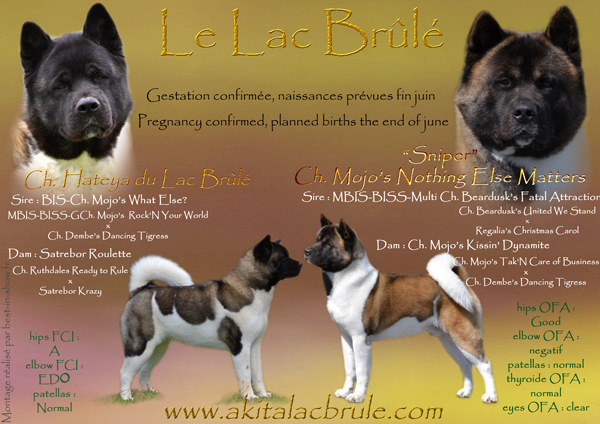 3 mâles et 3 femelles aux couleurs de leurs parents : - Entre soleil et orage, le week end dernier à Balma sous les jugements de M. Leneuf : (CPM) : Jeamara's A King of Magic "Dealer" : Très Prometteur - Meilleur Puppy. (CIM) : MBIS-Not by Chance but Destiny du Lac Brûlé "Chance" : CACS - BOS appartenant à Stéphane Teulière - CHAMPIONNAT DE FRANCE à Villepinte (Paris). Merci à Stéphane, son papa d'adoption, de sa confiance pour me laisser handler Chance, une fois de plus. Sous les jugements de M. Jouanchicot, en classe intermédiaire : MBIS Not by Chance but Destiny du Lac Brûlé "Chance" (Look'N Love du Lac Brûlé "Zelda x MCh. Mojo's Nothing Else Matters "Sniper") se classe 2ème Excellent. Ce dernier résultat va lui permettre de pouvoir demander la cotation 4 : "Étalon Recommandé" !!! Mai 2019 : - 4ème WE de mai : Spéciale Akita Américain à Villeneuve sur Lot, sous les jugements de Mme Lafay :