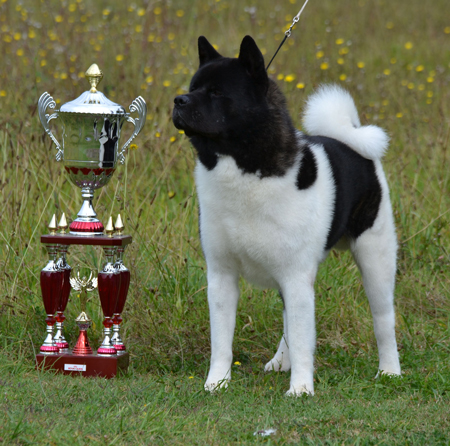 (COM) : MBIS Not by Chance but Destiny du Lac Brûlé "Chance" appartenant à Stephane Teulière : 1er Ex CACS / MEILLEUR DE RACE (BOB)..........MEILLEUR DE GROUPE !!........BEST IN SHOW !!!! - 2ème WE de Mai : - Les premiers bébés de 2019 sont attendus pour juin. La gestation de Ti Punch est confirmée, plus d'info dans la rubrique "Portées". - Suite aux derniers évènements, je n'ai pas eu le temps de publier les résultats des dernières expositions, ni d'annoncer le retour à l'élevage de Leïa (May the Force Be with You du Lac Brûlé), qui a participé à sa 1ère exposition avec moi. Le 1er we de mai était donc à l'exposition internationale d'Auch sous les jugements de Mme Round, avec très peu d'Akita (5 présents). Je n'avais pourtant pas la tête à ça, ma vieille Ashka (13,5 ans) était dans une situation très délicate. Je ne savais même pas si le soir en rentrant, elle serait toujours parmi nous. J'ai tout de même honoré mes engagements, afin que l'expo ne soit pas dépourvue de représentant de la race. (CPM) : Jeamara's A King of Magic "Dealer" : Très Prometteur / Meilleur Puppy (1/1).